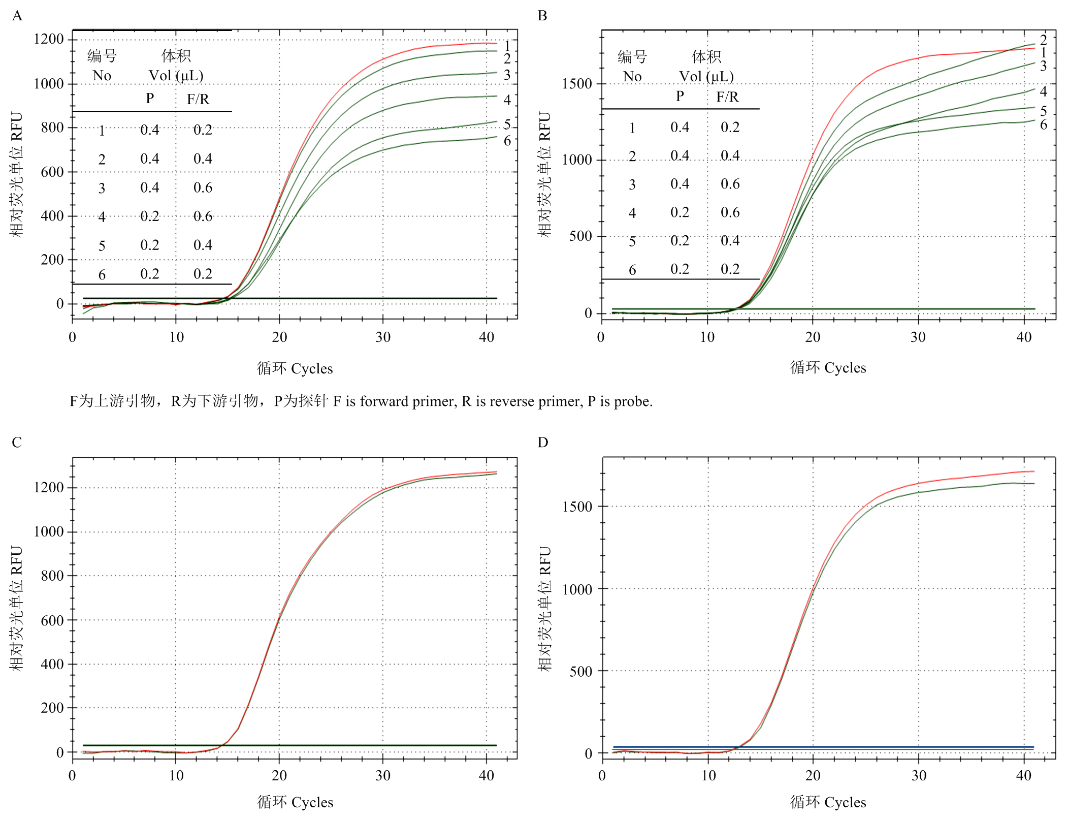 A:MDV 1实时荧光定量PCR方法引物和探针浓度优化;B:MDV 3实时荧光定量PCR方法引物和探针浓度优化;C:MDV 1实时荧光定量PCR方法退火温度优化;D:MDV 3实时荧光定量PCR方法退火温度优化