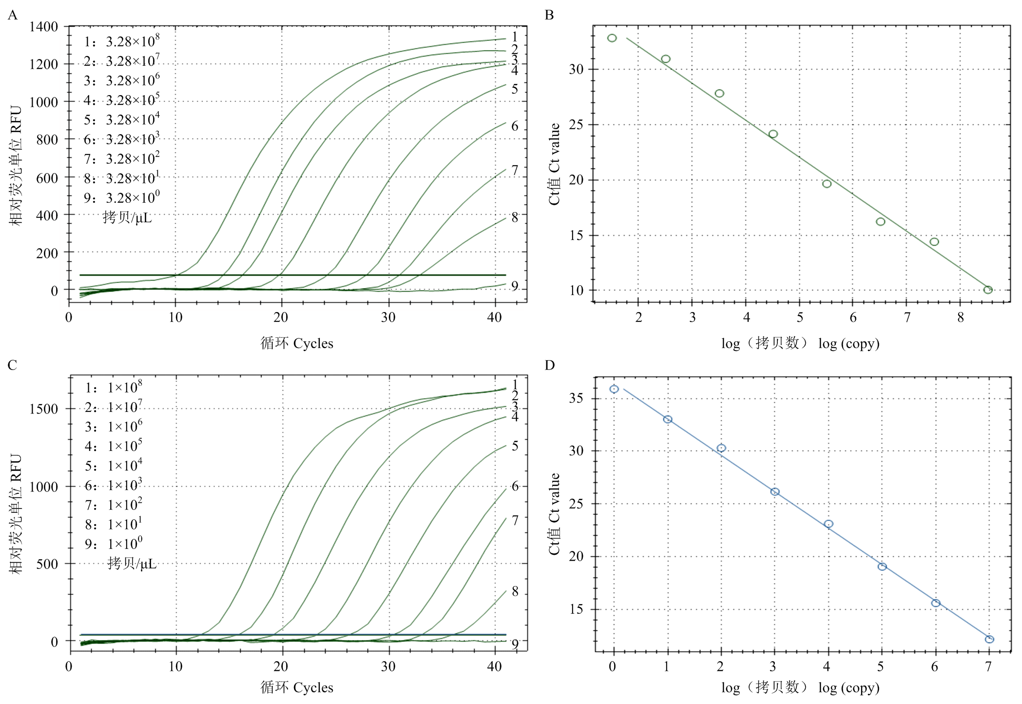 A:MDV 1实时荧光定量PCR方法基因拷贝数灵敏度的检测;B:MDV 1实时荧光定量PCR方法标准曲线的建立;C:MDV 3实时荧光定量PCR方法基因拷贝数灵敏度的检测;D:MDV 3实时荧光定量PCR方法标准曲线的建立