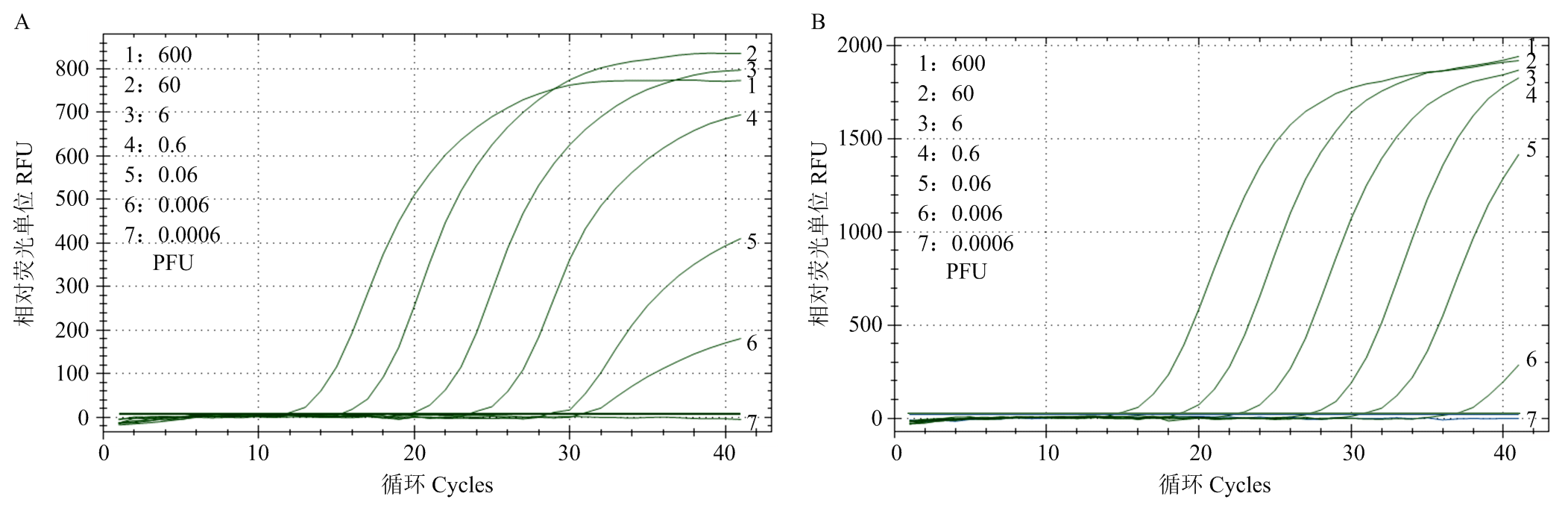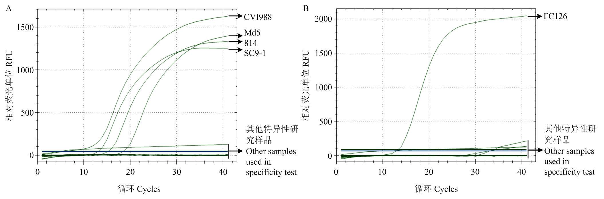 A:MDV 1实时荧光定量PCR方法特异性检测;B:MDV 3实时荧光定量PCR方法特异性检测